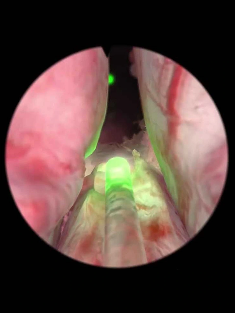 O laser de holmium possui características únicas que o tornam ideal para este procedimento. Sua energia é absorvida pela água dos tecidos, criando vaporização precisa com penetração tecidual mínima (apenas 0,4mm), garantindo segurança e precisão. A hemostasia (controle do sangramento) é excelente, reduzindo significativamente o risco de transfusão sanguínea.